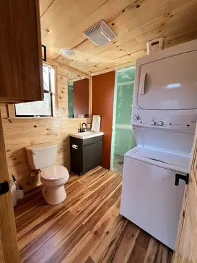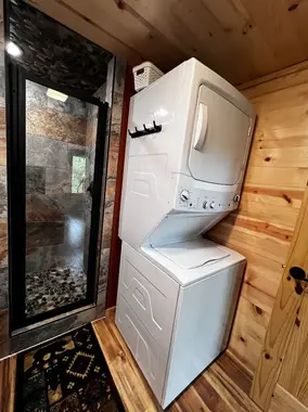 Panther Creek Cabin is 650 sq. ft space with a private bedroom with a queen bed and a sleeping loft with 2 twin beds. An addition twin bed can be set up with advanced notice. The sleeping loft is accessible by ships ladder. It has a full kitchen with anything you may need to prepare a full meal or brew a simple cup of coffee. The bathroom has a walk-in tile shower and a full-sized washer and dryer. The cabin has wireless internet and a smart television. The outdoor area has seating for 5 and a fire pit. On the front porch, you will find chairs and a gas grill. Off of the county dirt road, the cabin has a private entry gate and driveway. There is a 3 stall dog kennel directly behind the cabin for your use.